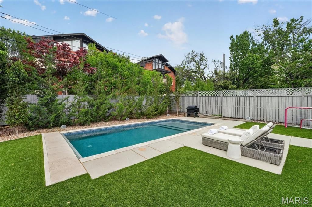 Chic, sophisticated living in the heart of Old Town Clayton-designed for those who expect the exceptional. Spanning four finished levels with a private three-stop elevator, this residence showcases 10' ceilings, rich hardwood floors, bespoke millwork, and designer finishes throughout. The main level is an entertainer's dream, featuring a formal living room with gas fireplace and French doors to a sweeping terrace with gas sconces, a stunning dining room with a custom glass wine wall, and a chef's kitchen/great room with an oversized center island, designer appliances, and a gas fireplace. Upstairs, the spa-inspired primary suite is a true retreat, complemented by three additional en-suite bedrooms and a laundry room. The third-floor flex space with a full bath and bar offers breathtaking, unobstructed views of the Downtown Clayton skyline. The ground level includes an oversized 2-car garage, mudroom, expansive rec room with bar, guest suite, and a private wellness space with a sauna. Outdoor living rivals a luxury resort, with a covered patio featuring a gas fireplace and built-in grill, a pool with an automatic cover, and a beautifully turfed, low-maintenance yard. All just steps from the best of Downtown Clayton. Fit for a King, this is elevated living at its finest. Prepare to fall in love.