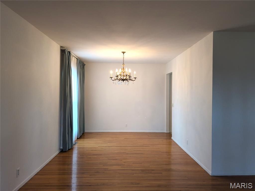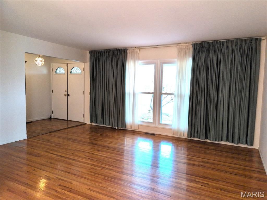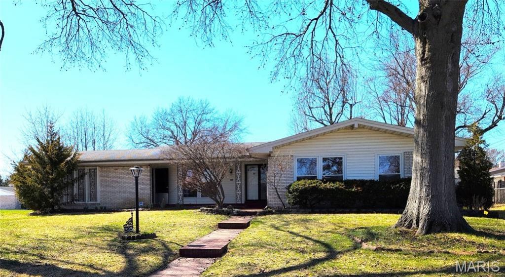 One of the largest 3-bedroom, 2-bath ranches in Paddock Meadows - move-in ready and City of Florissant code-approved. A covered front porch and double-entry doors lead to a foyer and gleaming hardwood floors throughout. Bright living room with large picture windows, formal dining room with crystal chandelier, and an eat-in kitchen with oak cabinets and appliances. A cozy breakfast spot at the kitchen window is perfect for birdwatching with your morning coffee. Spacious family room features a wood-burning fireplace and sliding doors to a large covered patio. Primary bedroom with full bath. Partially finished basement offers built-in closets, abundant storage, and flexible space for your plans. Oversized 2-car attached garage and a fenced corner lot.