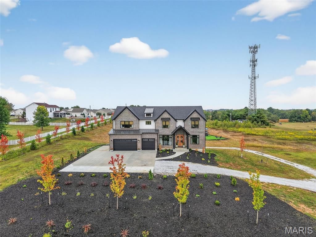 Experience luxury country living minutes from everything in this stunning two-story estate set on over 3 private acres. From the moment you step inside, soaring 10-foot ceilings & gleaming casement windows create an airy, light-filled atmosphere. The main floor flows effortlessly from your private office to a chef's dream kitchen with custom cabinetry, massive 9-foot quartz island, luxury KitchenAid appliances, & high-end finishes including a Delta Brizo pot filler. Hosting the holidays will be a dream with multiple options for dining & butler's pantry for preparation & storage. The family room boasts a cozy gas fireplace, views of the property & access to the covered patio area for the ultimate relaxation. Upstairs, vaulted ceilings, additional guest bath & bonus entertainment room with a beverage & snack station provide the perfect retreat. The home offers three en suites, including a massive primary suite with its own gas fireplace, custom walk-in closet, & spa-like bath. Guest bedrooms feature 9-foot ceilings, 2 en suites & custom built-ins for both function & style. A second-floor laundry room adds convenience. The lower level is designed with future entertaining & multigenerational families in mind-complete with private garage, rough-ins for two additional baths & walk out to patio entertaining. Don't forget the playground! This home is the perfect blend of refined elegance & practical comfort, offering unmatched space, privacy & amenities in an ideal location.