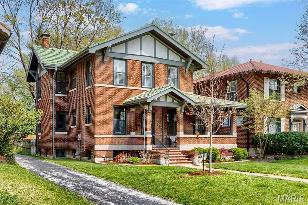 Exceptional U-City home with charming curb appeal, featuring a pillared front porch and distinctive green tile roof. Inside, you'll find a flexible floor plan with a spacious living area large enough to accommodate both living and dining spaces, as currently arranged. Highlights include oversized windows, hardwood floors, built-in cabinetry, a gas fireplace, and elegant moldings. The original dining room, now used as a family room, offers generous space with hardwood flooring, a bow window with transoms, and windows overlooking the backyard. This room connects to an enclosed side porch with brick flooring and original leaded glass windows. The kitchen is beautifully updated with features today's buyers seek, including gas cooking, a large center island with breakfast bar, and a walk-in pantry-rare finds in U-City. Additional highlights include large-format ceramic tile flooring, quality appliances, and direct access to the backyard. A discreet half bath off the kitchen completes the main level. Upstairs, the second floor includes three bedrooms, including a primary suite with a spacious walk-in closet. Two additional well-sized bedrooms and a large bathroom accessible from both the hallway and the primary closet. Completing this house is a finished rec room in the lower level that also provides tremendous storage space and a separate laundry room. Additional features include a two-car garage, a large deck, a fenced yard, gardens, an irrigation system with an app, and a motorized driveway gate. Ideally located on a wide street ending at walkways to Flynn Park Elementary, Flynn Park, tennis courts, and Winslow's Table-a community gathering spot. Convenient to Washington University, Forest Park, MetroLink, and more, this is a wonderful place to call home.