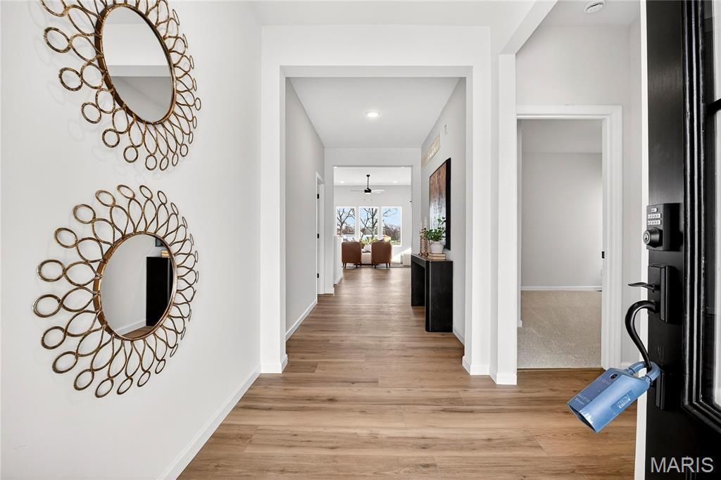 Audubon by Consort Homes in River Breeze Estates. This thoughtfully designed 1,734 sq ft home offers 3 bedrooms, 2 full baths, and a 2-car attached garage. The open-concept layout features a spacious great room with electric fireplace and flows seamlessly into the kitchen and casual dining area, creating an ideal setting for everyday living and entertaining. The kitchen includes stainless steel gas appliances, quartz countertops, custom cabinetry with soft-close doors and drawers, dovetail and full-extension drawer construction, pendant lighting, and a refrigerator cabinet. LVP flooring extends through the main living areas and primary bedroom. The main-level primary suite offers a walk-in closet and private bath with hardware. Two additional bedrooms and a full bath in the hall with hardware and an adult height vanity provide functional space for family or guests. Main-floor laundry adds convenience. Additional features include a full walk-out basement with 8-ft pour, rough-in bath, sump pump, smart thermostat, insulated low-E windows, and landscaped lot. Located in the Orchard Farm R-V School District.