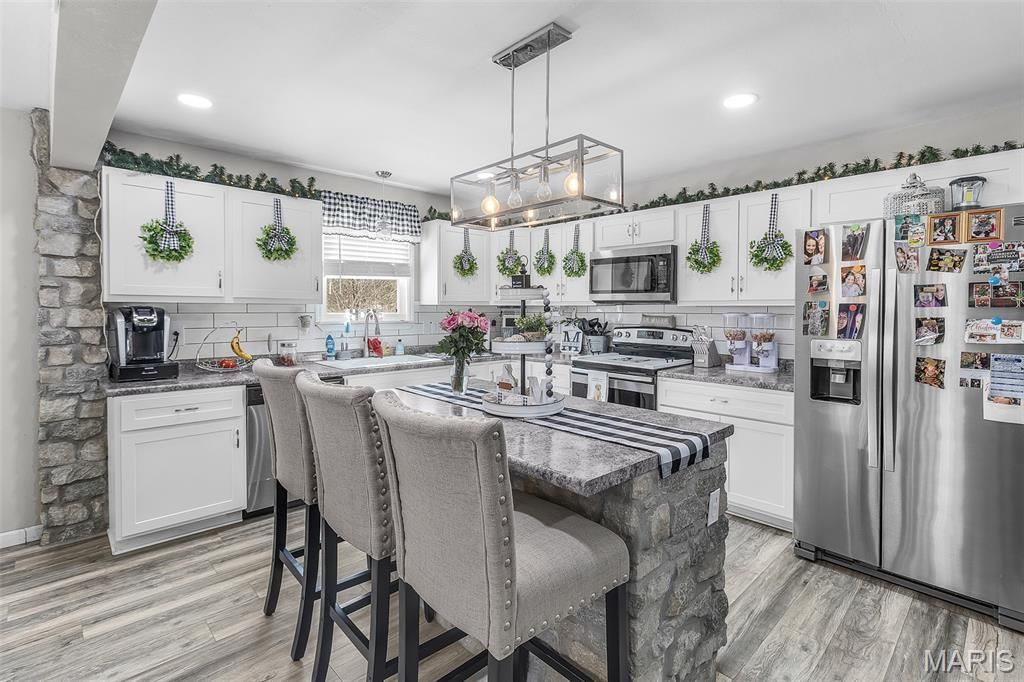 Welcome to this exceptional country ranch-style residence situated on a spacious corner lot, offering privacy, functionality, and timeless charm. This well-appointed home features four generously sized bedrooms and three full bathrooms, thoughtfully designed for comfortable everyday living and entertaining.The interior showcases custom stone accents, including a stunning stone kitchen island and elegant stone pillars framing the dining area, creating a warm and refined focal point. The primary suite offers a private retreat complete with a tiled walk-in shower. Newer carpet and updated flooring throughout enhance the home's modern appeal while maintaining its rustic character.Additionally, there is a loft located above the two-car garage, ideal for additional storage space or could be converted into additional living quarters. Outdoors, enjoy a fully fenced, private yard with a wood deck, perfect for relaxing or hosting gatherings. The property also includes an approximately 15' x 25' concrete shed equipped with a 30-amp RV hookup, along with a private well and two septic systems, providing efficiency and convenience.This property offers the perfect balance of space, quality features, and peaceful surroundings-an excellent opportunity for those seeking refined country living with modern comforts.