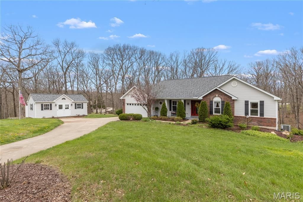 Welcome home to this beautifully maintained 3 bed, 3 full bath ranch nestled on 3 private acres in sought-after Foristell in Wentzville School District! From the moment you arrive, you'll appreciate the peaceful, wooded setting, long driveway, and additional outbuilding-perfect for storage, hobbies, or a workshop. Inside, the home offers a warm and inviting layout with laminate flooring, a vaulted great room with stone fireplace, and abundant natural light throughout. The updated kitchen features white cabinetry, granite countertops, stainless appliances, center island, and opens seamlessly to both dining and living spaces-ideal for everyday living and entertaining. Convenient main floor laundry adds to the ease of one-level living. The spacious primary suite offers serene backyard views, a large walk-in closet, and an gorgeous updated bath with dual vanities, soaking tub, and separate shower. With 2 Additional main floor bedrooms and full bath provide flexibility for family, guests or home office. The finished lower level expands your living space with a large rec area, bar, full bath, and dedicated media space-perfect for entertaining. Step outside to your private retreat featuring a covered patio, extensive paver patio space, and a cozy firepit area surrounded by mature trees-an ideal setting for relaxing evenings or gatherings. This rare combination of space, privacy, and functionality with modern updates makes this property a must-see!
