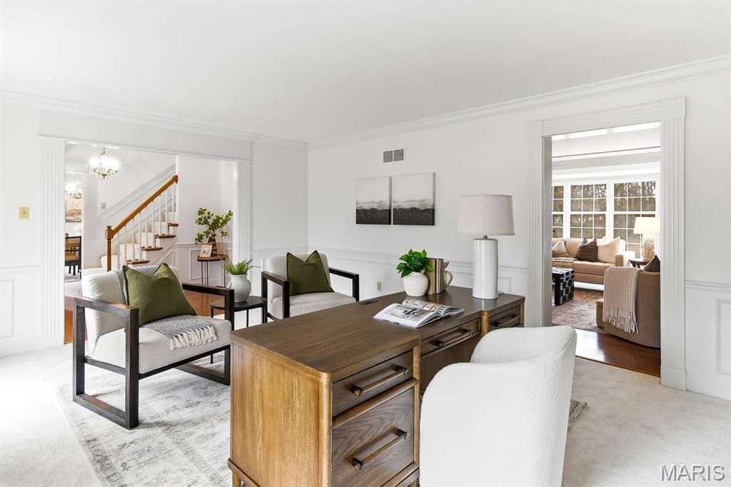 Classic, stately 4-bedroom, 2 1/2 bath two-story home set on one of the most level and desirable lots in Meadowbrook Country Club. Offering 2,868 square feet of above-grade living space, the property has been meticulously maintained with several key updates and is very livable as it stands today. An excellent opportunity for buyers to personalize over time and make it their own. Built in 1978-newer than many homes in the MCC subdivision-the home benefits from an improved floor plan, higher ceilings, and more modern design elements, all paired with an outstanding lot. Main floor features a spacious living room with wood flooring, a bay window, built-ins, a wood-burning fireplace, and a wet bar/butler's bar area. The layout offers great flow and functionality throughout. The kitchen includes granite countertops, stainless steel appliances, an electric cooktop, and a wall oven/microwave combination, all open to a bright breakfast room, connected to the formal dining room. Wainscoting, upgraded millwork, solid six-panel doors, and crown molding throughout many areas of the home add to its refined style and character. Upstairs, the primary suite offers a walk-in closet and private bath. Three additional bedrooms and a full hall bath with dual sinks complete the upper level. An oversized rear-entry garage provides ample space for parking, storage, or a workshop. This is a clean, well-cared-for home and it is being sold as-is. Great opportunity for buyers seeking space, location, and the ability to update to their own preferences. HVAC, carpet/pad, and some plumbing and mechanical components have been updated.